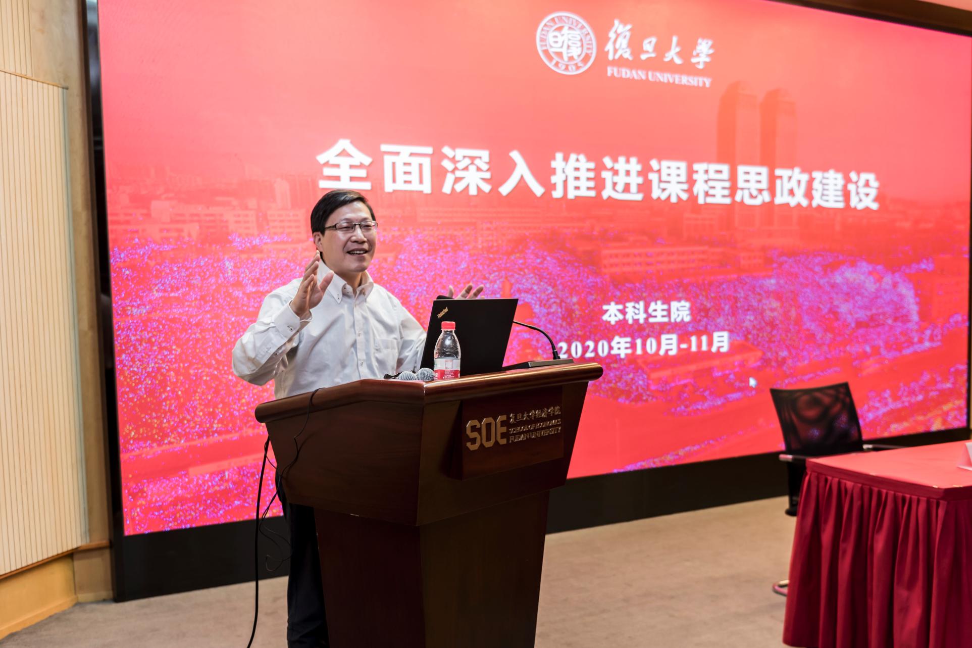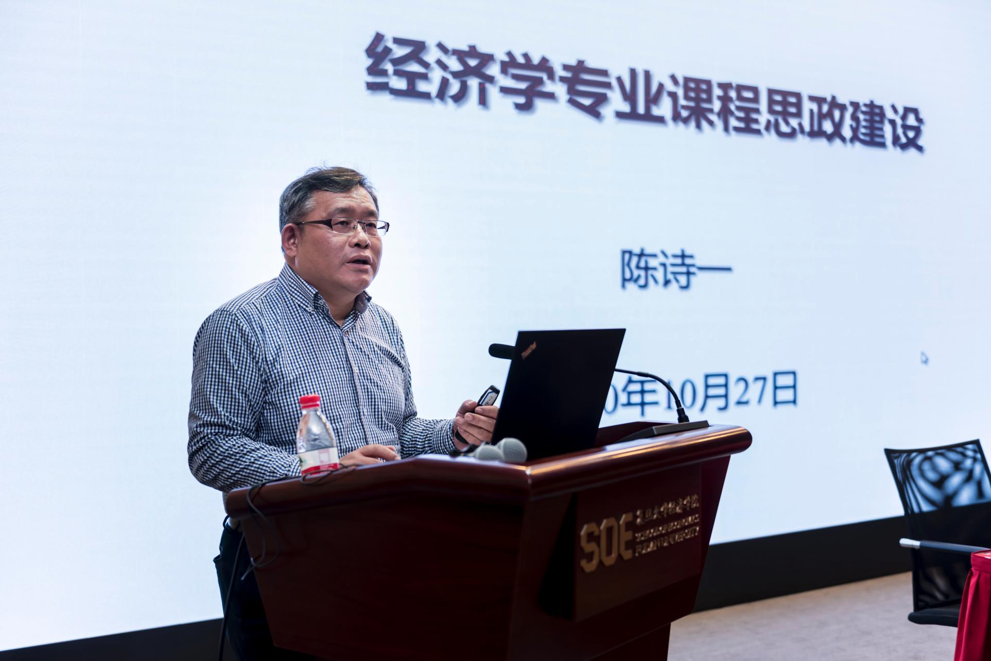 对课程思政建设的总体要求,介绍了学校和学院课程思政工作的进展情况及未来行动计划。接下来,陈诗一分享了他对课程思政的理解以及开展经济学专业课程思政的想法和建议。课程思政本质上就是在教学中坚持育人初心,激发教师教书育人主体活力,在正确价值引领前提下,根据不同专业、不同课程、不同学段特点,有针对性地把育人元素自然融入课程教学,达到春风化雨、润物无声的育人效果。经济学专业课程思政建设更应与学院中国经济研究以及服务国家和地方发展战略相结合,紧紧围绕马克思政治经济学中国化、西方经济学中国化、中国古代经济思想现代化以及中国经济改革发展实践理论化四条线索,开展中国经济研究,把一流的经济研究成果引入课堂教学,把成熟的教学成果纳入中国经济教材。学院和各系所中心将根据实施方案定期组织教师培训以及教学团队和教研室集中研讨,挖掘院史和各经济专业史中的育人佳话和学脉传承,讲好中国经济改革故事,阐述中国经济理论规律,激发学生自豪感、使命感和责任感。学院将在各位教师课程思政教学实践基础上评选优秀案例、优秀课程与优秀教师,不断提升教师育人能力,不断提高学院育人与育才成效,培养具有国家意识、人文情怀、科学精神、专业素养、国际视野,德智体全面发展的社会主义建设者和接班人。