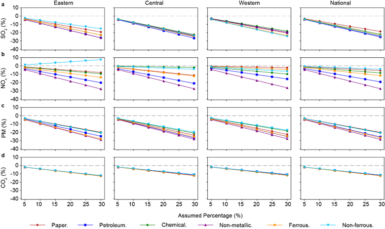 图3:工业部门推进电气化的间接协同减排效益。a:二氧化硫(SO2);b:氮氧化物(NOx);c:颗粒物(PM);d:二氧化碳(CO2)