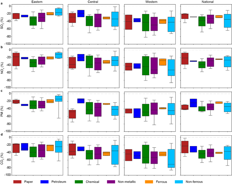 图2:能源使用效率提升为不同行业带来的直接协同减排效益。a:二氧化硫(SO2);b:氮氧化物(NOx);c:颗粒物(PM);d:二氧化碳(CO2)