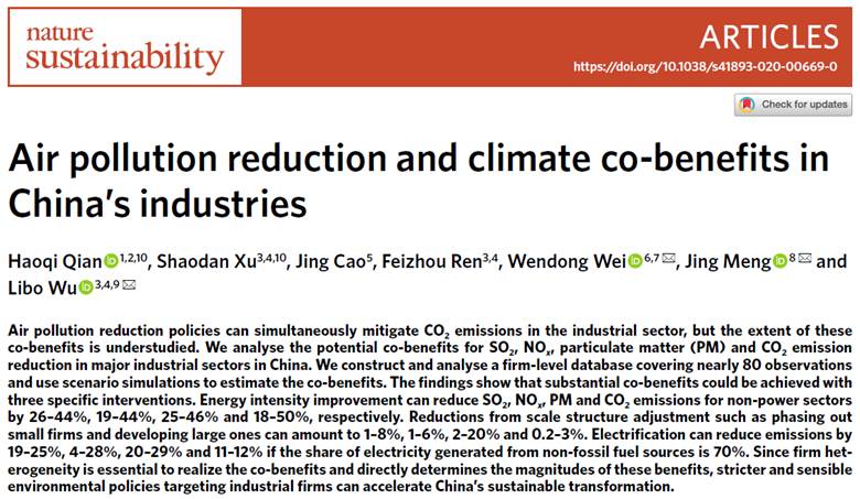 吴力波课题组牵头,联合校内全球公共政策研究院、大数据研究院与大数据学院团队,以及校外伦敦大学学院、上海交通大学与清华大学团队,利用我国工业部门微观企业的能源消耗与空气污染物排放数据,对我国工业部门空气污染物与二氧化碳协同减排潜力的微观机制进行了深入研究。结果表明,持续提升能源使用效率、合理布局并调整现有工业部门的生产结构、加快推进电气化水平以及大力发展非化石能源发电是实现我国工业部门协同减排效益的重要途径。相关研究成果于1月4日以长文(Article)形式在线发表在《自然-可持续发展》(Nature Sustainability)。