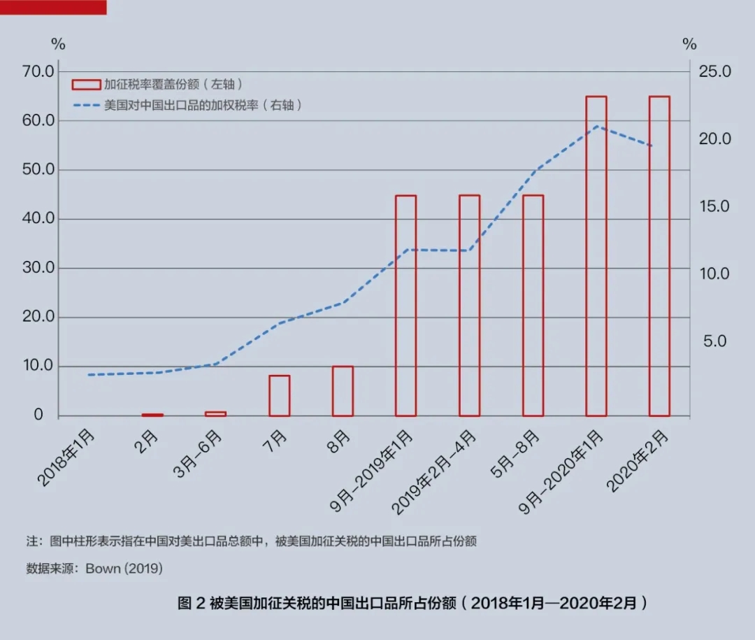 至此,美国关税率已经接近中国关税率的水平。2018年1月,中国关税率高出美国关税率4.9个百分点,到2020年2月后,则只高1.6个百分点。但是,这种趋同并不是建立在以规则为基础的贸易协定上,而是建立在美中对大幅上升的关税成本的忍耐程度上。更为严重的是,大部分美中贸易商品仍然在承受这种高税率压力。