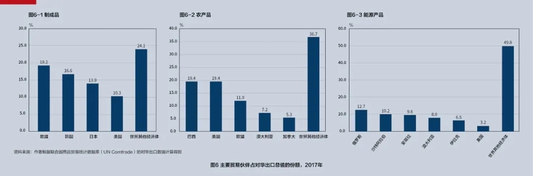 为说明第一阶段协议对其他贸易伙伴可能造成的出口挤出风险,我们利用联合国商品贸易统计数据库(UN Comtrade)的对华出口数据,计算主要贸易伙伴占对华出口总值的份额。这些数据是2017年的,因此不受2018年开始的美中贸易冲突和2019年第一阶段协议的影响。如图 6-1所示,在对华制成品出口上,美国份额低于欧盟、韩国和日本。如图 6-2所示,在对华农产品出口上,美国份额低于巴西,但高于欧盟、澳大利亚和加拿大。如图 6-3所示,在对华能源产品出口上,美国份额低于俄罗斯、沙特阿拉伯、安哥拉、澳大利亚和伊拉克。这意味着,在第一阶段协议之前,享受同样最惠国待遇的情况下,美国对其他贸易伙伴没有绝对优势。然而,第一阶段协议实质上赋予美国进入中国市场并扩大其份额的特权,这是对其他贸易伙伴的歧视,导致它们对美国处于劣势。