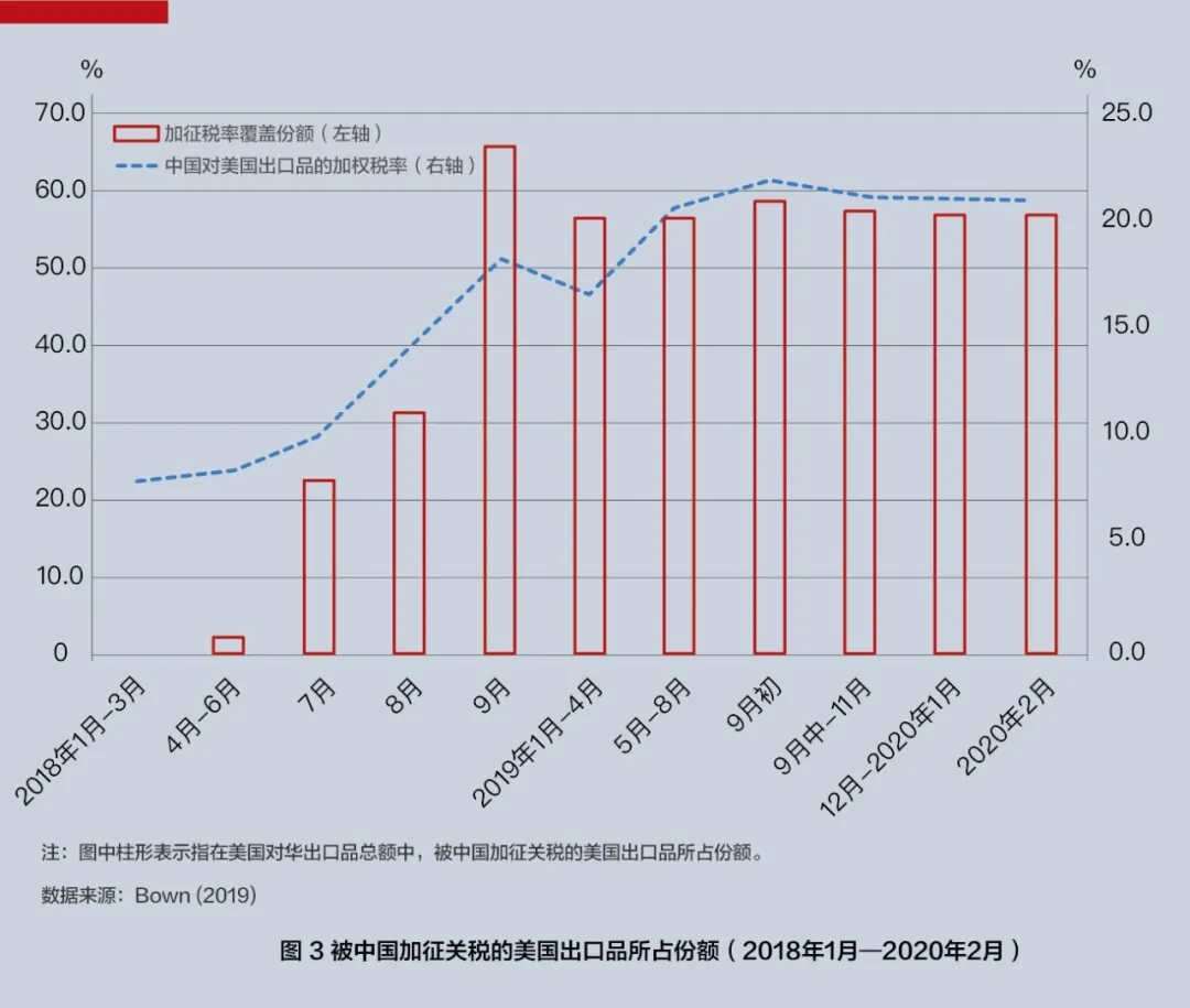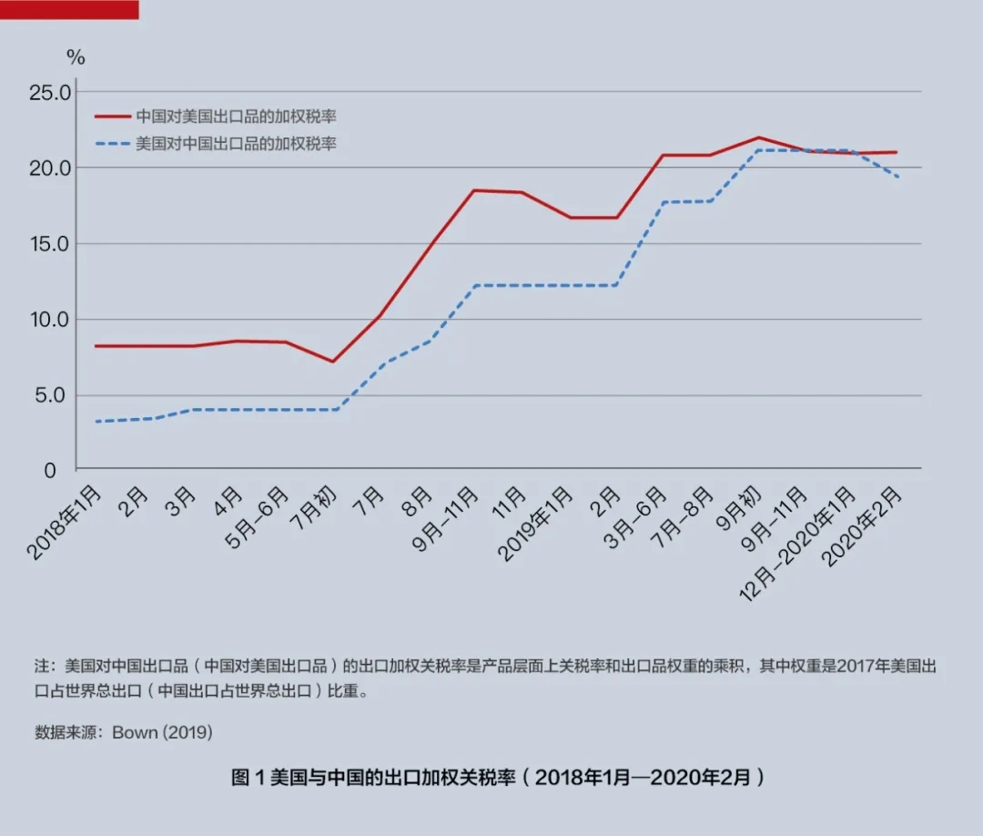 第三轮为2019年3月至今,美中贸易关税率在上升中趋同。2019年5月和9月,美国根据特别301法案分别对2000亿和3000亿美元的中国出口品加征10%~20%的关税,使出口加权关税率从12%增长到21%。到2020年2月初,美国将特别301法案涉及的1150亿美元中国出口品的加征关税率从15%下调到7.5%,使得税率略微下降到19.3%。对此,中国只在2019年6月对600亿美元的美国出口品加征关税,但随后允许进口商申请加征关税排除,并继续推行对外资企业信息技术商品的减税,这使中国关税率从16.5%上升到21.8%的峰值,之后下降到20.9%。