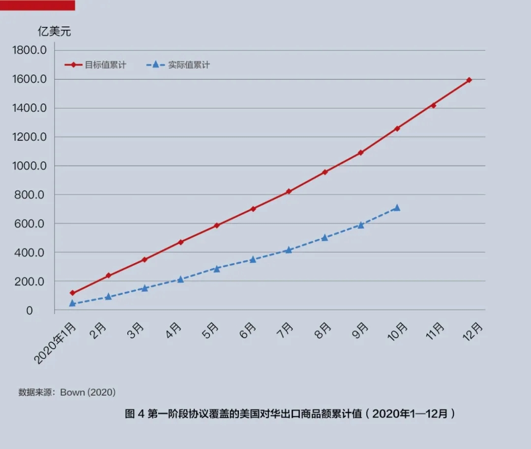 图4展示了第一阶段协议覆盖的美国对华出口商品额累计值。显然,从2020年1月开始,每月对华出口实际值就没有达到理论目标值。并且,到10月份,对华出口实际上只完成了目标值的57%,这表明实际值对目标值的缺口越来越大了。按此路径,要求中国在2020年余下两个月补足尚未完成的43%进口目标,这是非常不现实的。