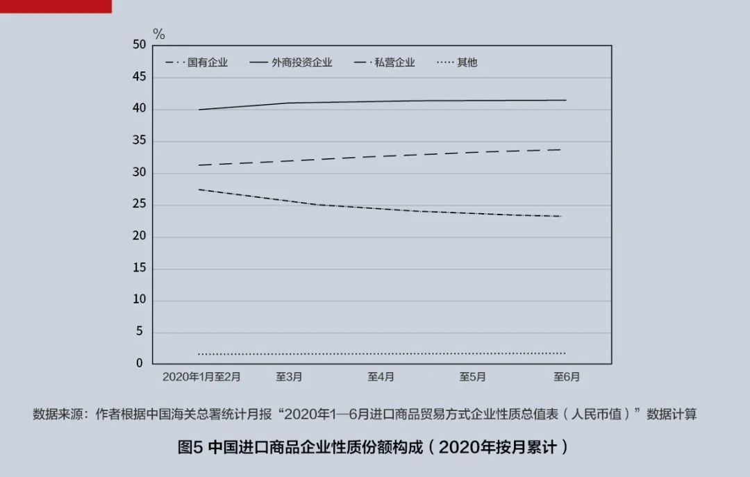 另外,高关税率下,中国私营部门不会主动去采购美国商品。如图 5所示,2020年1—6月中国进口总额中,外商投资企业占41.4%,私营企业占33.7%,它们对扩大中国进口贡献最大。然而,这些私营实体不愿承受高额关税负担。因此,没有来自中国市场主要部分的需求,美国对中国进口难以快速增长。