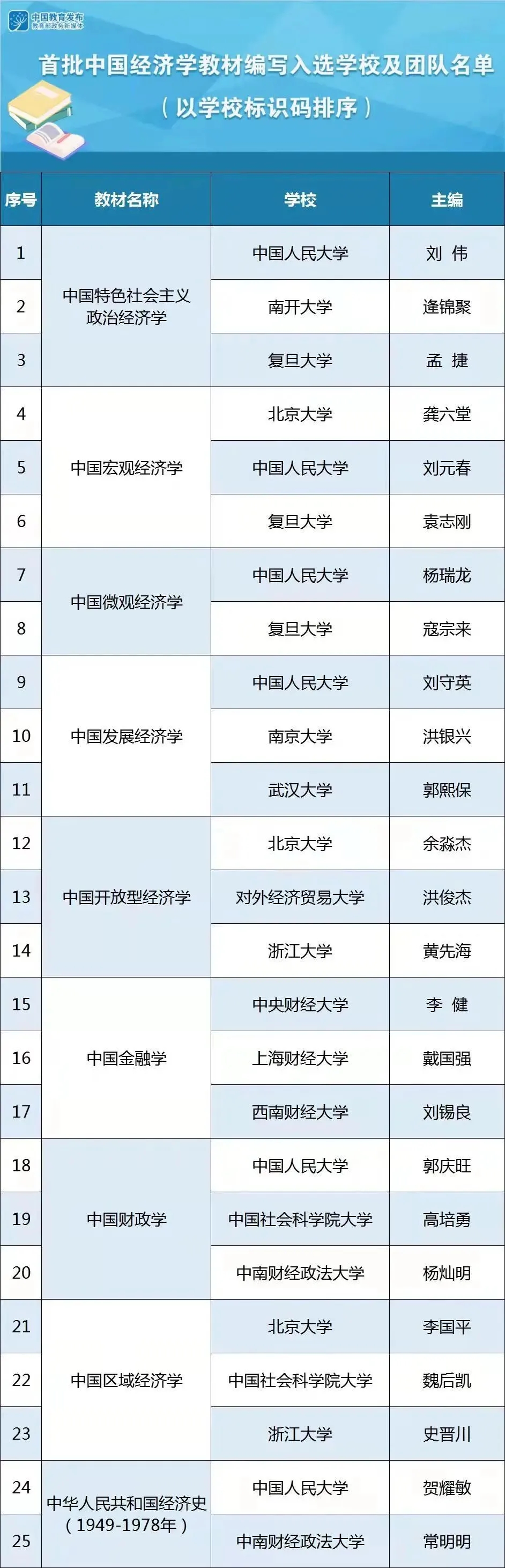孟捷教授领衔的《中国特色社会主义政治经济学》编写团队、袁志刚教授领衔的《中国宏观经济学》和寇宗来教授领衔的《中国微观经济学》教材编写团队正式入选。另外入围的还有陈诗一教授领衔的《中国财政学》编写团队和田素华教授领衔的《中国开放型经济学》编写团队。