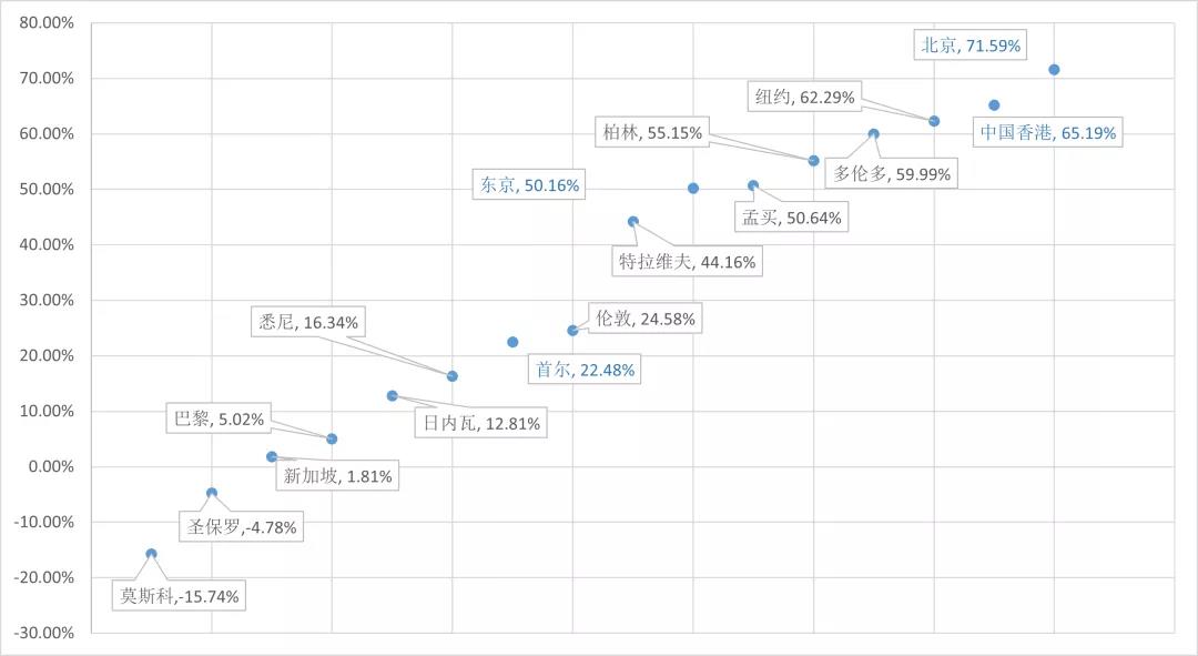 ▲图2B 世界各地区代表性国家近十年房价变化趋势图 | 数据来源:GPG(Global Property Guide)