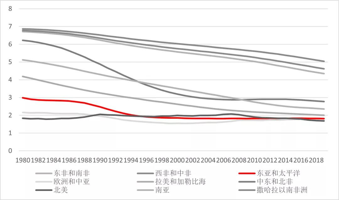 ▲图1A 世界总体分地区生育率趋势图 |数据来源:世界银行
