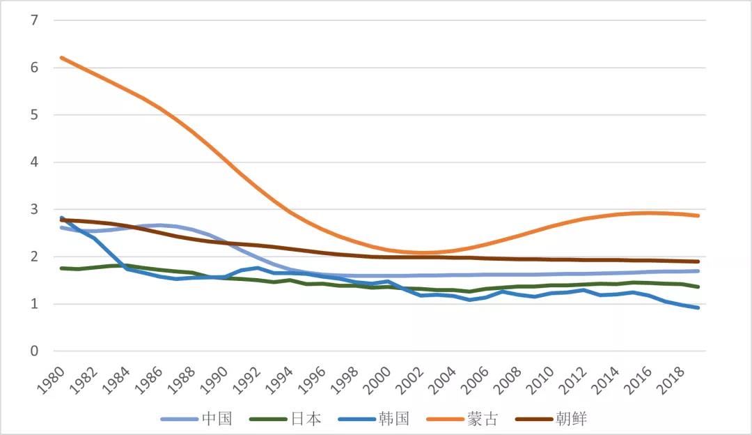 ▲图1B东亚部分国家出生率趋势图 | 数据来源:世界银行