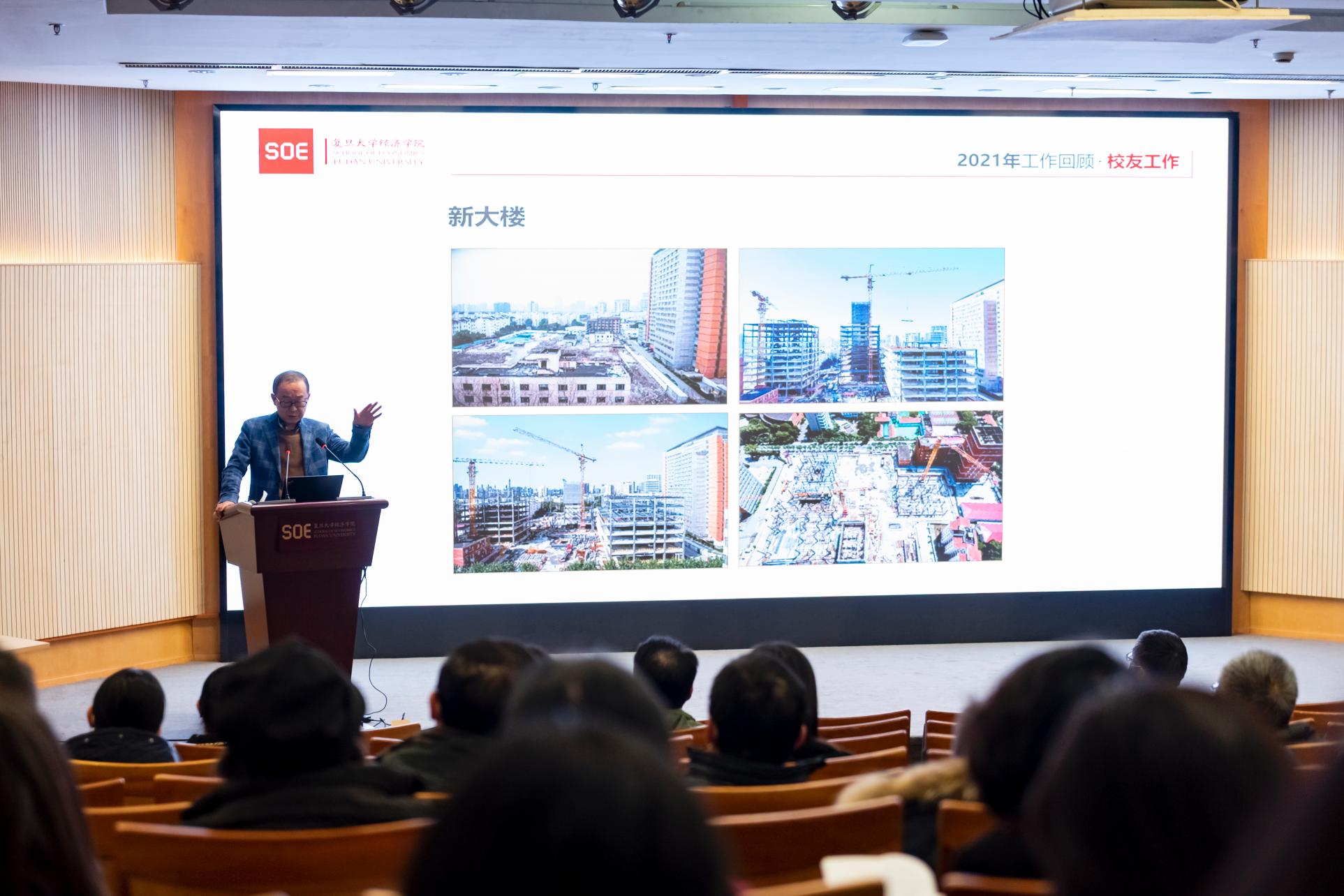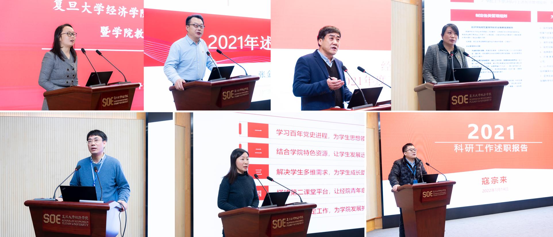 工会主席詹璐老师作工会工作总结,她指出2021年度工会始终秉承倾听教职工心声、了解教职工需求,做有广度、有温暖、有实效的基层工会的目标,以建设“民主之家”、“学习之家”、“人文之家”、“温暖之家”为主线开展工作。詹璐老师通过2021年度各项活动的精彩剪影,全方位呈现出教职工的风采,同时她也对工会2022年度工作进行了展望:持续推进“建家”常规工作;创新活动形式;助力经济学科百年庆祝活动;开展多层次的民主座谈会。接着,张金清副院长对研究生教学成果进行展示:招生工作稳步推进、教学改革扎实开展、学科建设成效明显、学位工作严控质量、校企合作深化开拓,学科评估和专业学位水平评估工作圆满完成,成果获奖佳音频传,研究生招生、培养、学位工作有序推进。在肯定2021年度工作的同时,也指出2022年度要做好研究生的思政培育,打造一流导师队伍和专业学位品牌,引导研究生教育高质量发展。随后,田素华副院长对本科生教学工作进行了汇报。主要介绍了高质量人才培养体系的构建、“2+X”本科培养方案的落实、课程思政和教材建设工作的推进以及教师教学质量、本科教学管理与服务质量的提升等工作内容,他还特别感谢了各位老师的支持理解与关心建议。他表示,2022年会稳步推进一流本科专业建设工作和经济学基础学科拔尖学生培养计划2.0基地建设工作,推进两个双学士学位复合型人才培养项目落地,完成若干标志性本科教学成果。此后,刘军梅副院长总结了其分管的行政与校友两方面工作。在行政方面,她主要介绍了2021年度疫情防控与安全防护、基建修缮、新闻宣传、物业与行政服务以及行政人员核心能力建设等工作内容,强调2022年的工作重点是经济学科百年纪念活动、新大楼建设与功能规划、基建维护和常态化疫情管理。在校友服务工作方面,刘军梅副院长展示了由学院牵头、各联络处落地的各种丰富多彩的校友活动,其中包括复旦首席经济学家论坛、外滩智本汇沙龙等具有深远影响力的活动。同时,针对严峻的疫情形势,日本av片