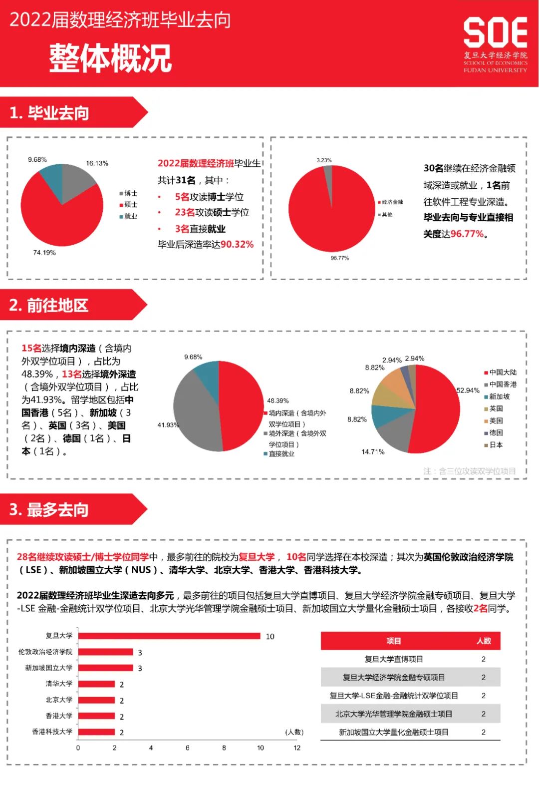 从2005年组织筹建“经济学专业(数理经济方向)”,经过长达17年的创新探索,形成了一套比较成熟的经济学拔尖创新人才培养模式;并于2021年获批“教育部基础学科拔尖学生培养计划2.0基地”。2022届数理经济班毕业生共31名,继续深造率达90.32%,选择直接工作的占比为9.68%。其中15名学生选择境内深造(含境内外双学位项目),占比为48.39%;13名学生选择境外深造(含境外双学位项目),占比为41.93%。5名学生选择攻读博士学位,占比为16.13%;23名学生选择攻读硕士学位,占比74.19%。