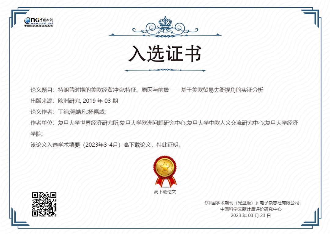 丁纯教授的合作论文《特朗普时期的美欧经贸冲突: 特征、原因与前景——基于美欧贸易失衡视角的实证分析》(发表于《欧洲研究》2019年第3期)入选中国知网学术精要数据库(2023年3-4月)高下载论文。目前已被下载4700余次。