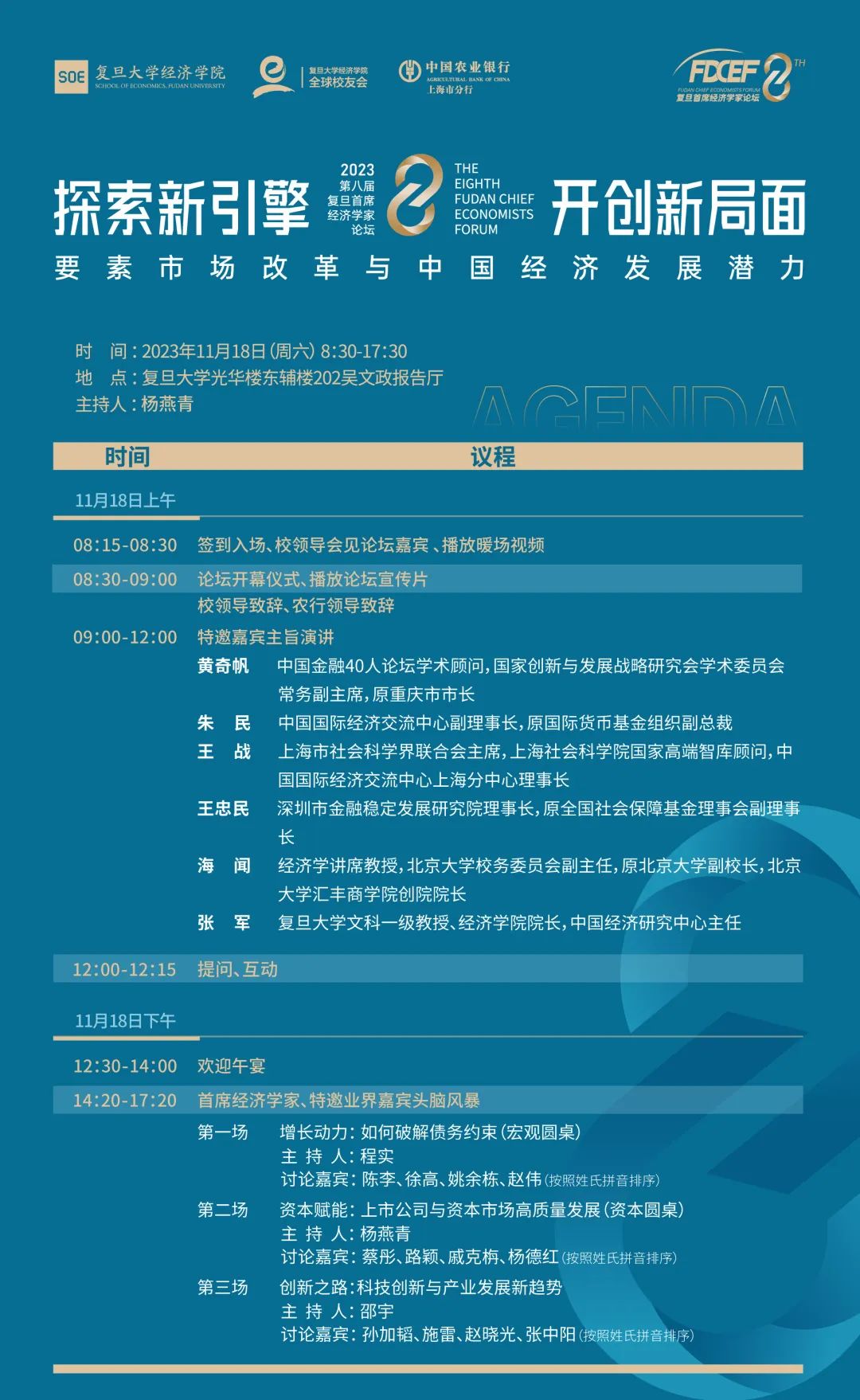 和复旦经院全球校友会主办,中国农业银行上海市分行独家承办的第八届复旦首席经济学家论坛将于2023年11月18日再度开启,届时论坛将以“探索新引擎、开创新局面:要素市场改革与中国经济发展潜力”为主题,邀请知名经济学家,洞察全球经济周期分化特征,以服务国家经济战略为主旨,探索中国经济新引擎和要素市场改革,论证要素价格形成机制和市场运行机制,研究高质量、高效率推动中国经济发展的潜力。