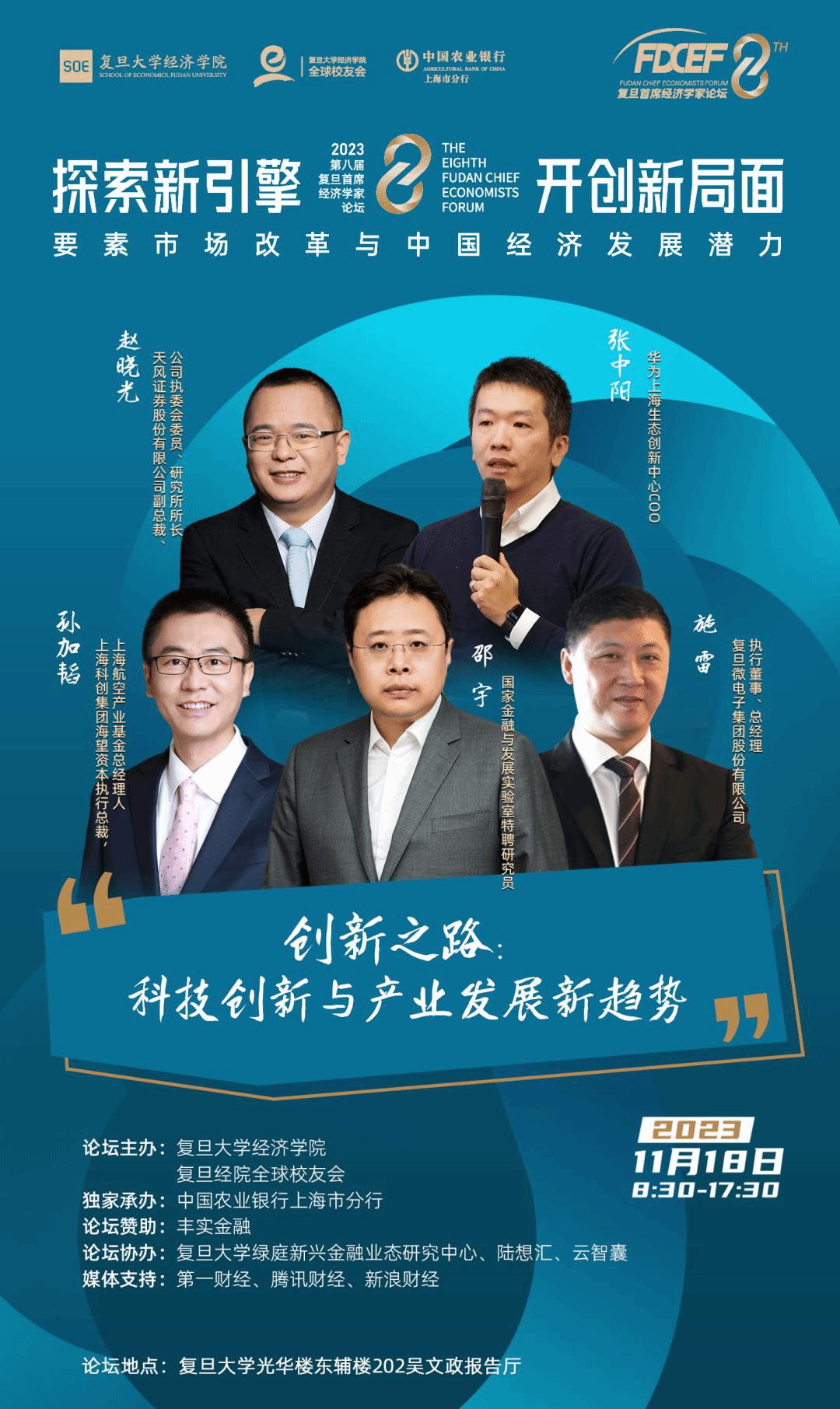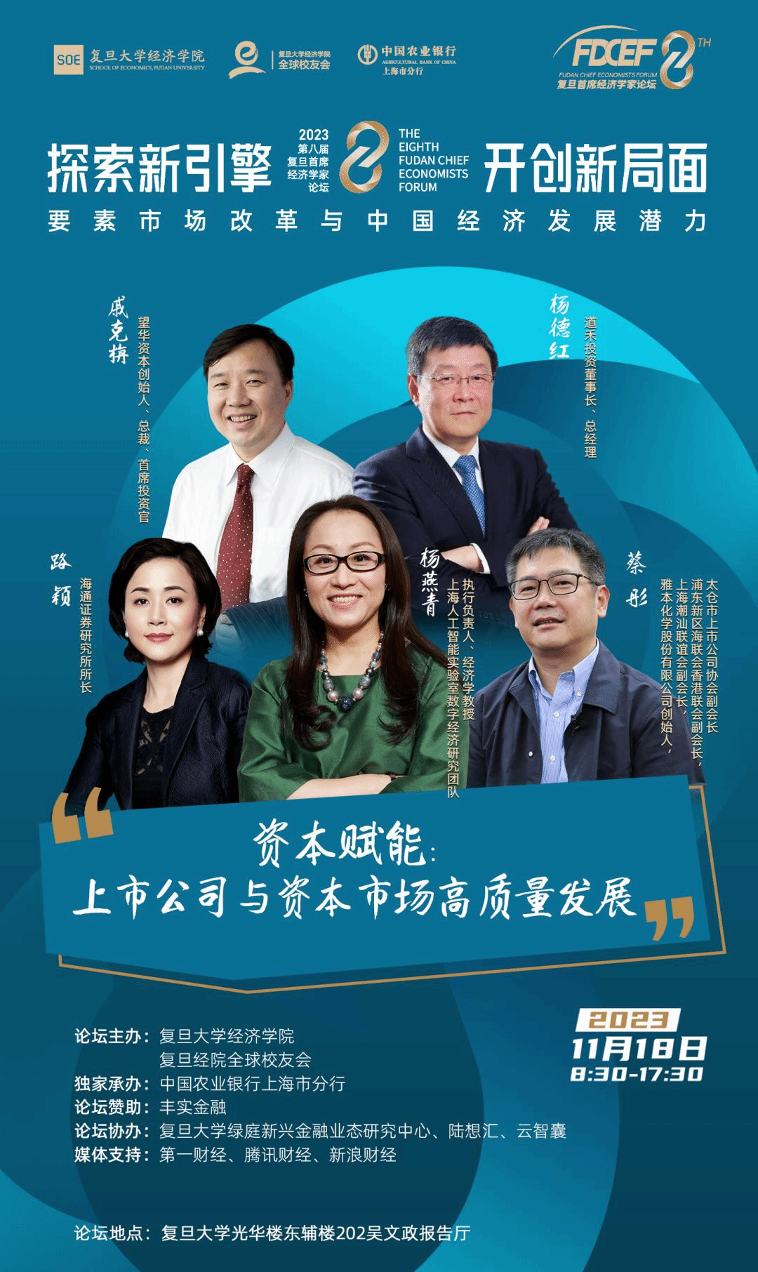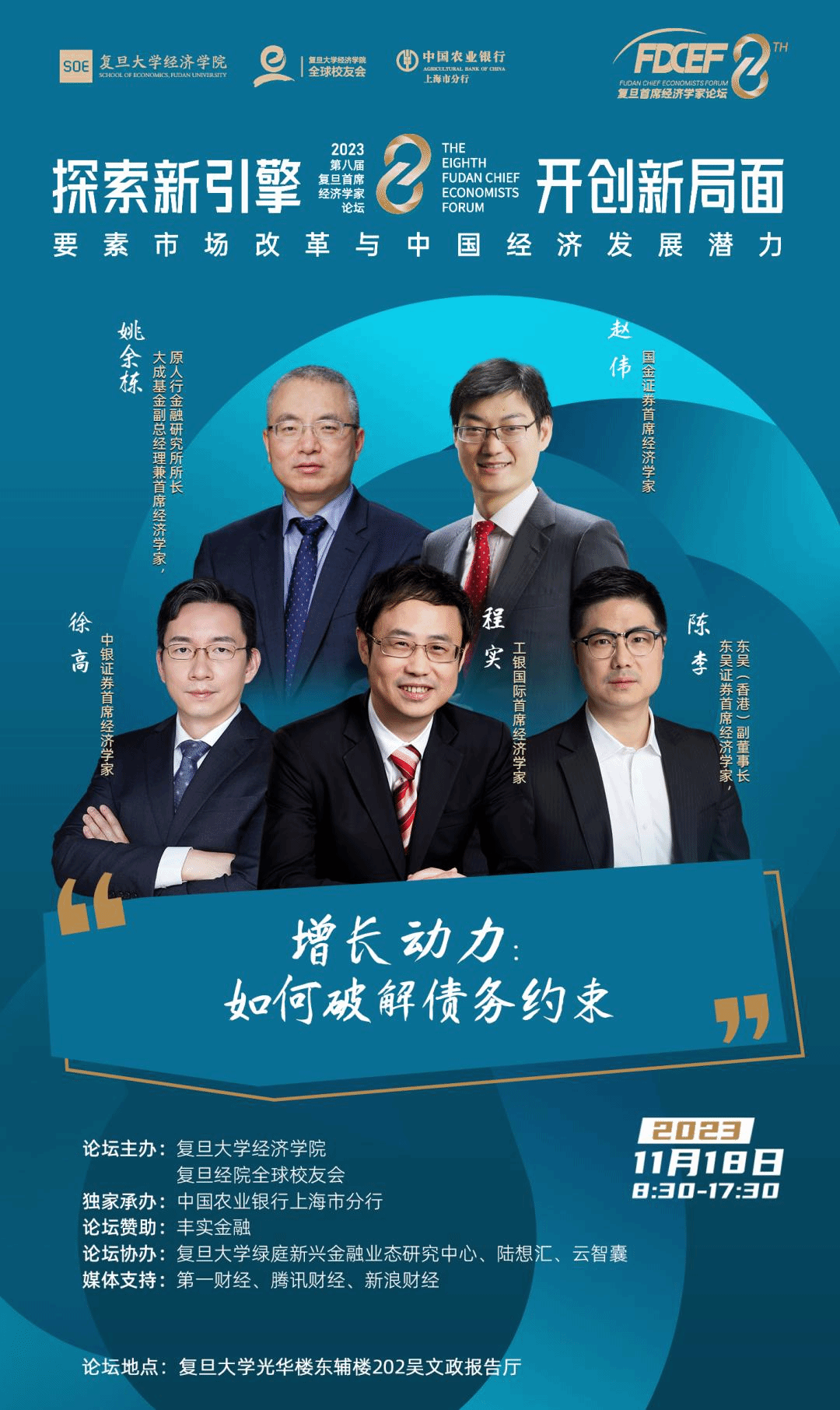 和复旦经院全球校友会主办,中国农业银行上海市分行独家承办的第八届复旦首席经济学家论坛即将再次拉开帷幕。此次论坛将聚焦全球经济挑战及未来发展趋势,以“探索新引擎、开创新局面:要素市场改革与中国经济发展潜力”为主题,邀请知名经济学家,洞察全球经济周期分化特征,以服务国家经济战略为主旨,探索中国经济新引擎和要素市场改革,论证要素价格形成机制和市场运行机制,研究高质量、高效率推动中国经济发展的潜力。