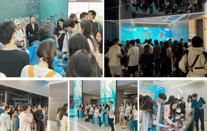 首先,师生们在讲解员的带领下参观了基地沙盘,在这里师生们可以了解到老港基地的基本情况包括基地的地理位置、占地面积、主要功能区域,同时沙盘前的生态数字平台展示着上海各区的垃圾运输情况、基地发展历程及里程碑等。老港基地在固废处理领域积累了丰富的经验,拥有先进的垃圾焚烧发电、填埋场管理及资源回收利用等多项核心技术。公司运营的大型垃圾处理设施每日处理大量城市生活垃圾,实现垃圾减量化、资源化和无害化处理的目标。