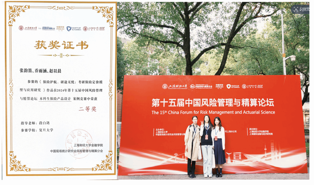 保险学专业2024级硕士生队伍(赵健飞、瞿耀、徐唯轶)凭借其参赛作品——“数据驱动,精准守护:非标准体寿险产品创新之路——从重疾险出发”在决赛中荣获二等奖;保险学专业2022级本科生队伍(徐孟瑜、张荣堂)凭借其参赛作品——“「心」安年金,守护长久——心脏病患者群体的专属养老年金”在决赛中荣获三等奖。