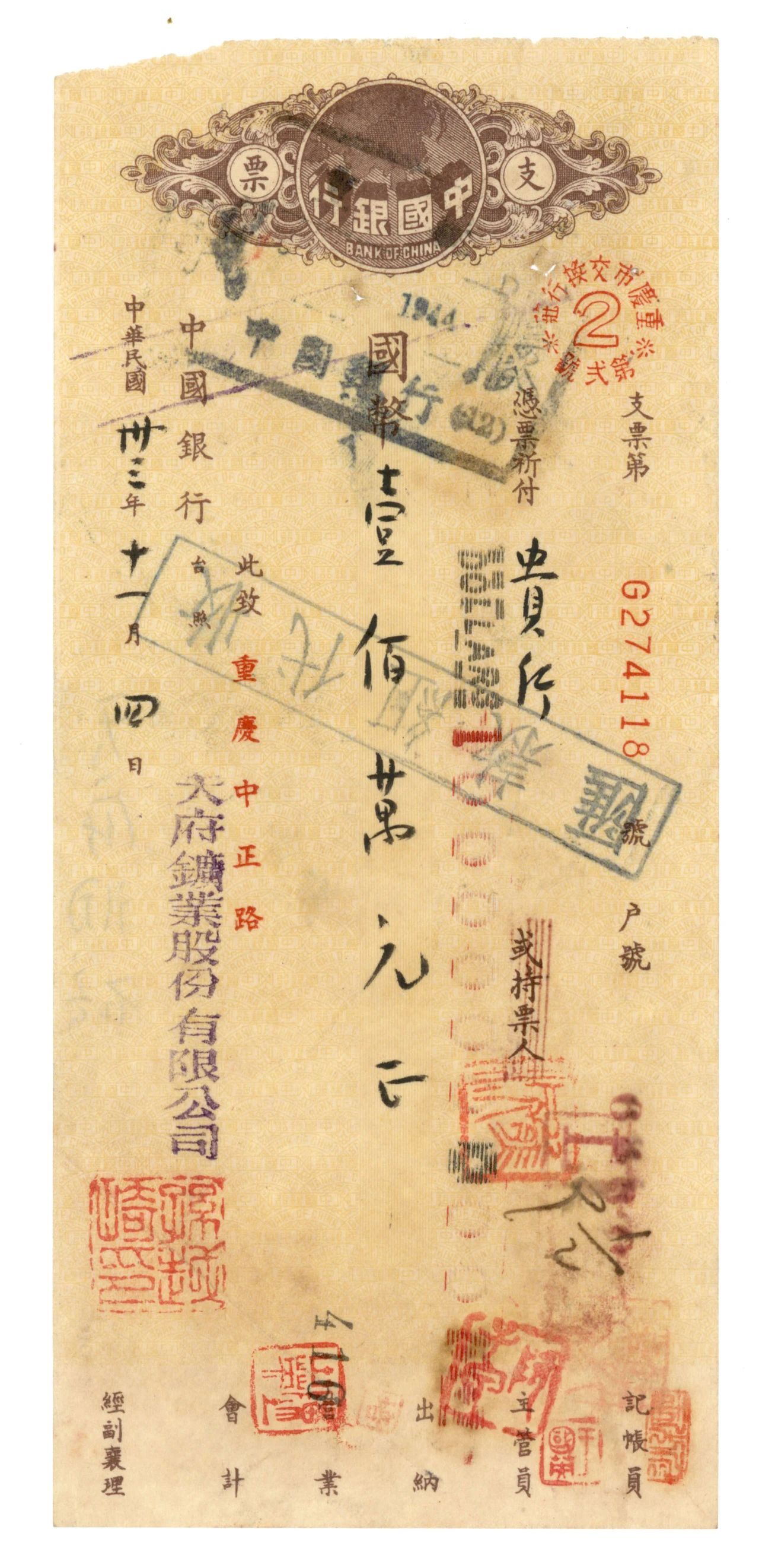 其中包括天府矿业股份有限公司、嘉阳煤矿股份有限公司支票,上面盖有总经理孙越崎印章。孙越崎是著名爱国者、实业家,日本av片