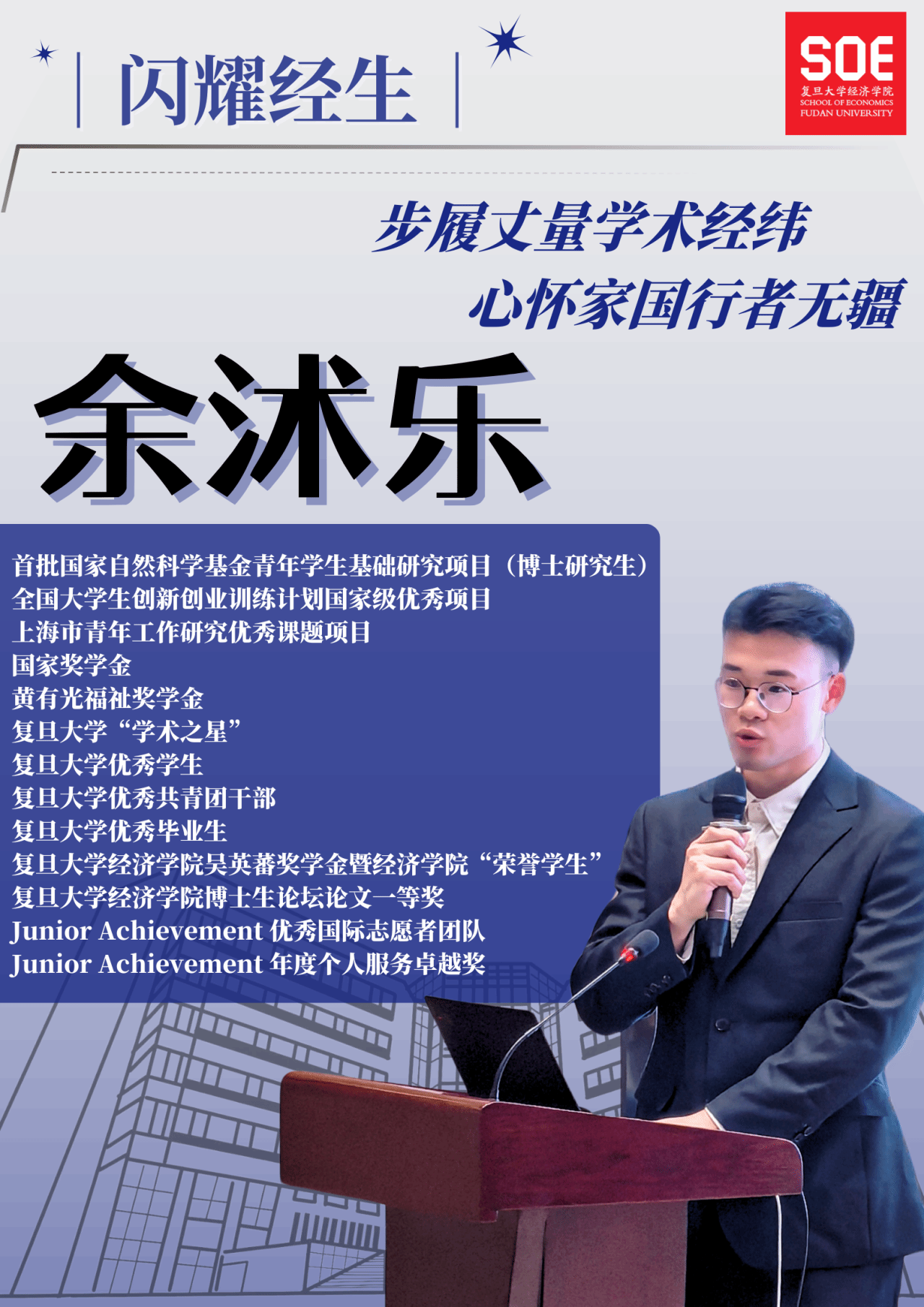 “学术之星”(特等奖提名),国家奖学金、黄有光福祉奖学金、吴英蕃奖学金等多项荣誉获得者。他深耕人工智能与劳动力市场研究前沿,足迹跨越学术高峰与社会实践,以“行者”姿态诠释新时代复旦经院人的责任与担当。