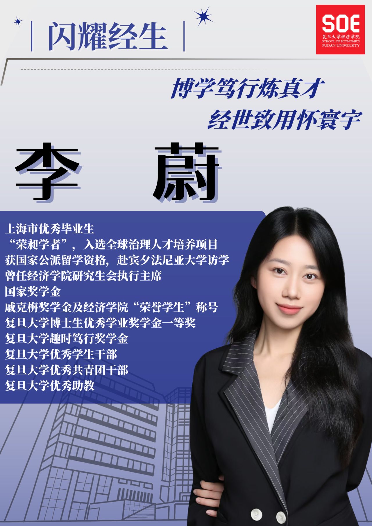 作为一名闽南人,李蔚最喜欢的词是“人生海海”, 十年复旦经院求索,让她心有所锚、行有所向。无论风浪如何变幻,她都将以“博学笃行、经世致用”的精神,坚定深耕中国经济实践的学术初心,笃定前行。