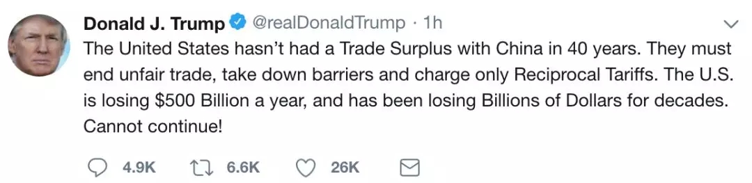 当地时间4月7日,美国总统特朗普再度在推特上就中美贸易问题发帖称,美国近40年来从未对中国有过贸易顺差,每年都损失5000亿美元,这样的情况不能再继续下去。此前,特朗普于5日发表声明说,他已指示美国贸易代表办公室依据“301调查”,考虑对从中国进口的额外的1000亿美元商品加征关税是否合适。