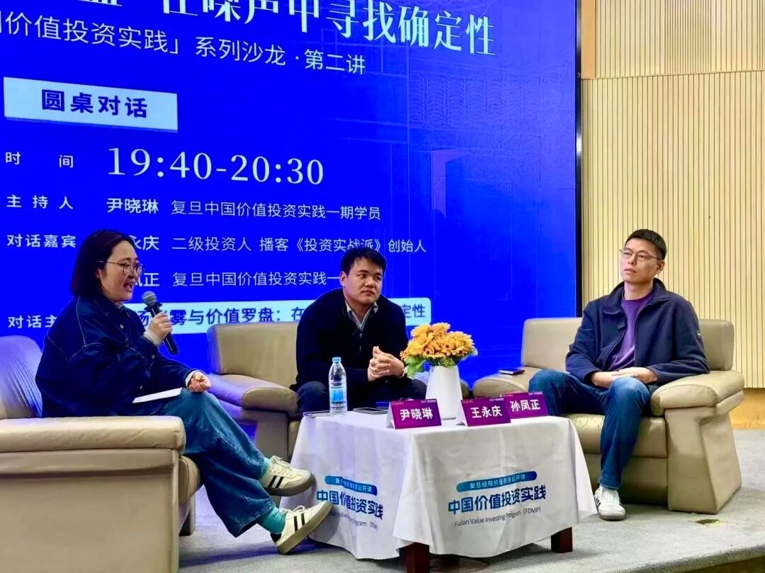 当晚,一场聚焦“市场迷雾与价值罗盘:在噪声中寻找确定性”的价值投资沙龙接续展开。《投资实战派》创始人王永庆带来分享“价值投资者,如何理解市场”,并与复旦中国价值投资实践一期学员代表孙凤正、主持人尹晓琳展开圆桌对话。王永庆提出价值投资的三大支柱:理解企业、理解市场、认识自己,并强调“聚焦1%的高质量公司”的实战心法。对话中,“不赚泡沫的钱”“下跌时才敢上仓位”等金句频现,凸显了价值投资者在波动中所需的理性、纪律与长期视野。