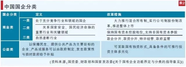 国企分类改革被认为是深化国企改革最重要的方式之一。然而在分类的标准上却有值得商榷之处。在2015年8月发布的《中共中央、国务院关于深化国有企业改革的指导意见》中,分类推进国企改革被正式确定为国企改革的方向之一。2015年12月29日,国资委、财政部和国家发改委发布的《关于国有企业功能界定与分类的指导意见》对国企分类和改革措施进行了细化,将国企分为商业类和公益类,其中“商业类国有企业按照市场化要求实行商业化运作,以增强国有企业经济活力、放大国有资本功能、实现国有资产保值增值为主要目标,依法独立自主开展生产经营活动,实现优胜劣汰,有序进退”。(参见表2)