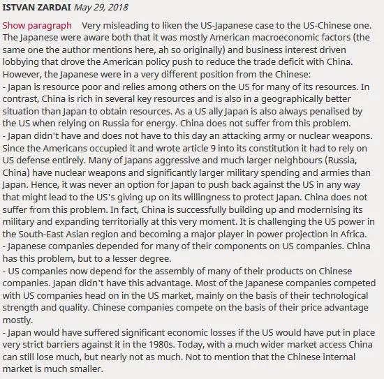 ISTVAN ZARDAI:将日美问题和中美问题进行类比是有误导性的。日本人很清楚,美国宏观经济因素(与作者提到的相同)和受商业利益驱动的游说活动促使美国采取了旨在减少对华贸易赤字的策略。不过,日本人与中国人所处的位置是不同的: