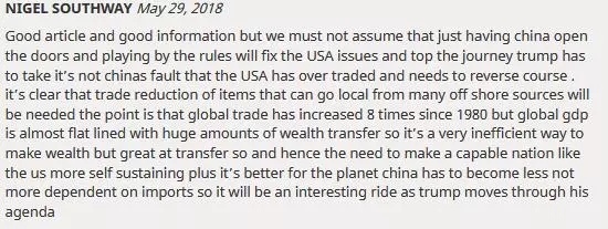 NIGEL SOUTHWAY:很不错的文章,提供了很好的信息。不过,我们不应认为使中国开放市场、遵守规则就能解决美国的问题,不应认为特朗普因此就万事大吉了。美国进口了太多东西,美国需要逆转这一趋势,但这并非中国的错误。很显然,我们需要将很多外国商品国产化以降低这部分的进口。但问题在于,自1980年以来,全球贸易额已经增长了8倍,但全球GDP规模并未显著增加,大量财富其实被转移走了。所以说,当下的经济体系在创造财富方面并不高效,但在转移财富时却效率很高。因此,我们需要让像美国这样的强国变得自给自足起来,而且这对全世界也是有好处的。此外,中国也应该降低对进口的依赖,那样的话,特朗普接下来的任期会变得很有趣。