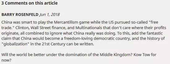 BARRY ROSENFELD:当美国追求所谓的“自由贸易”时,中国却在打重商主义的牌,这是非常明智的。希拉里、华尔街金融界以及那些并不关心利润来自哪里的跨国公司们,他们并没有注意到中国到底在做什么。考虑到这一点,再加上那些“中国会成为自由民主国家”的想象力过于丰富的言论,21世纪“全球化”的历史现在应该已经可以提前写就了。这个世界在中央王国的领导下会变得更好吗?眼下是不是该叩头了呢?