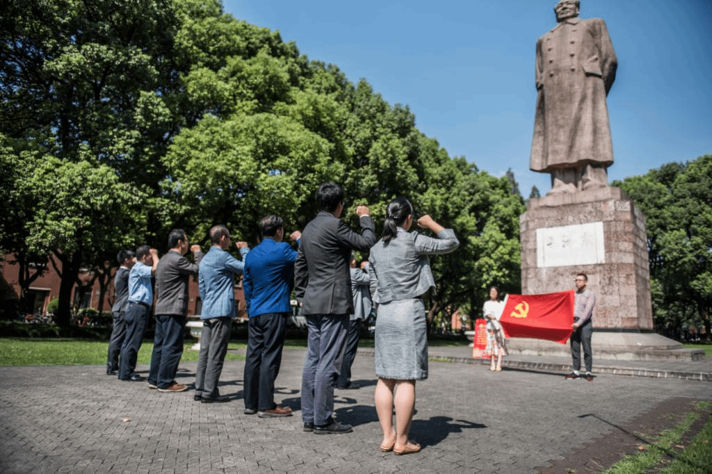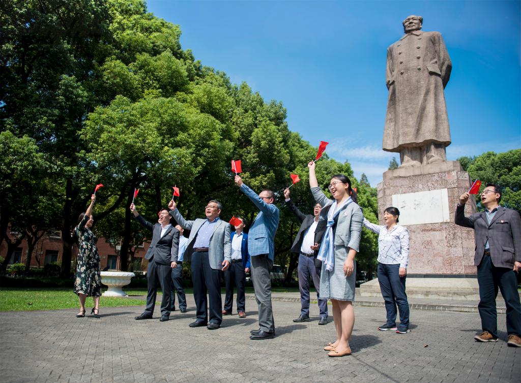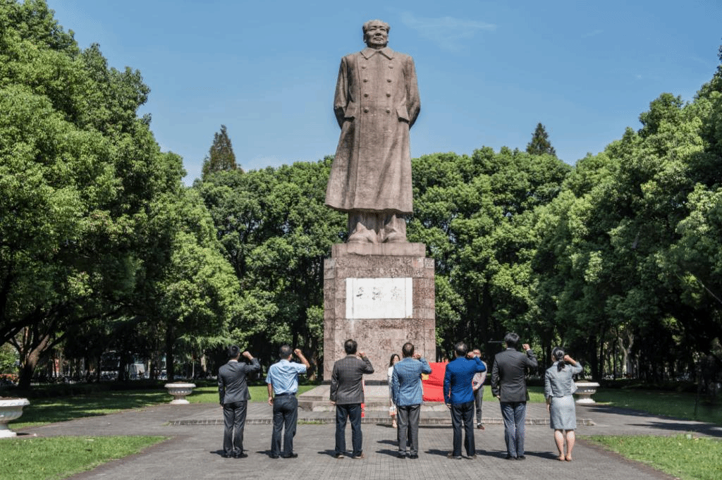 毛主席雕像前重温入党誓词,歌唱《我和我的祖国》,并在学院开展“不忘初心,牢记使命”主题教育首场集中学习:学原著,悟原理。