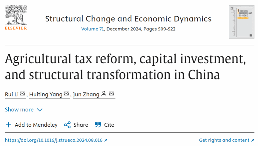 博士生杨惠婷在Structural Change and Economic Dynamic发表论文Agricultural tax reform, capital investment, and structural transformation in China(中国农业税改革、资本投资与结构转型)。