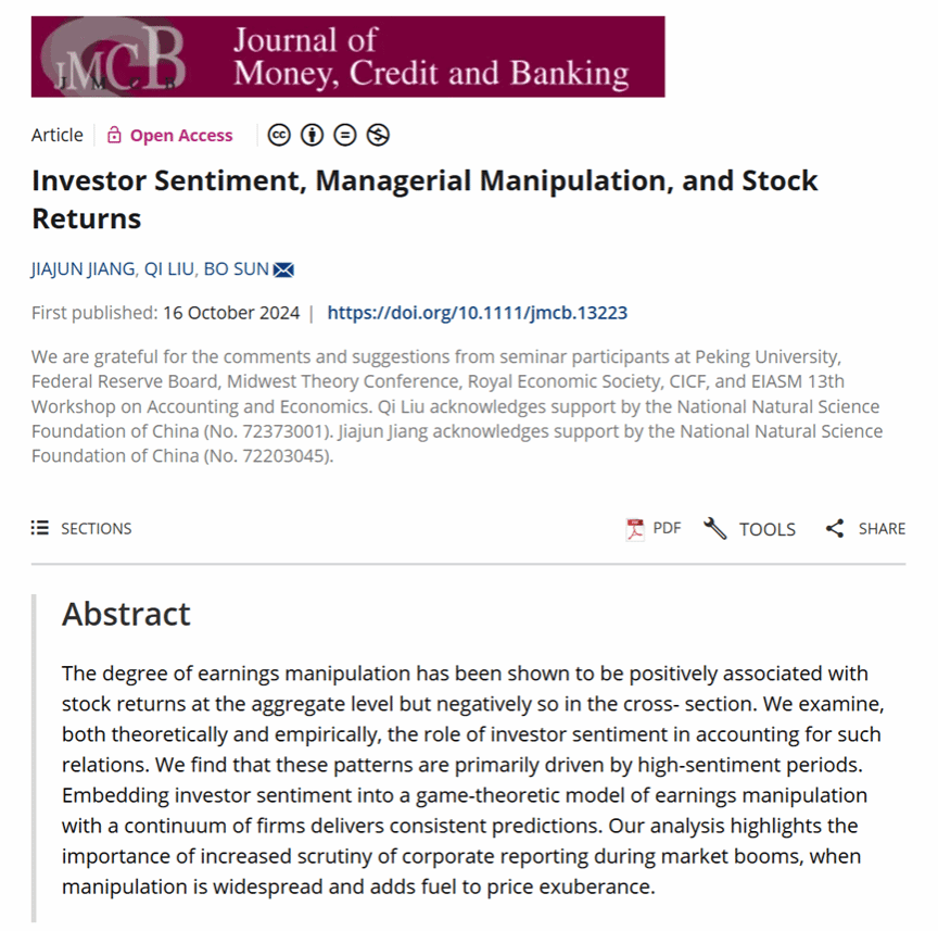 江嘉骏副教授与两位合作者的研究论文 “Investor Sentiment, Managerial Manipulation, and Stock Returns” 在金融学领域国际权威期刊Journal of Money, Credit and Banking 在线发表。
