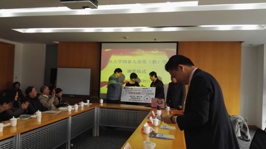 最后,我院保险系教师徐文虎、陈冬梅作为代表,接受了国泰人寿保险股份有限公司奖学金的捐赠。