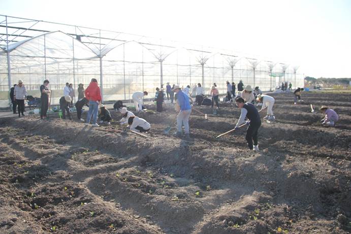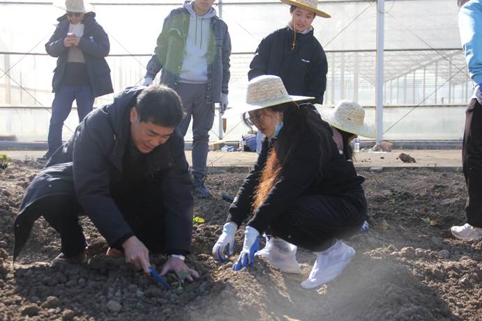 在大棚外边每个小组的“责任田”里,同学们也都忙得不可开交。从零开始种植包菜,工作量很大,时间很长,考验着每个小组的分工协作。同学们有的挖沟有的松土,有的挑水有的施肥,在南方的冬日里把一颗颗菜苗、把一颗颗希望种进了蕴育着希望和未来的土地。老师们更是亲自下田,拿起工具与同学们一同耕作,为大家示范了高效的劳动方法,将劳动实践的氛围变得更加轻松愉悦。