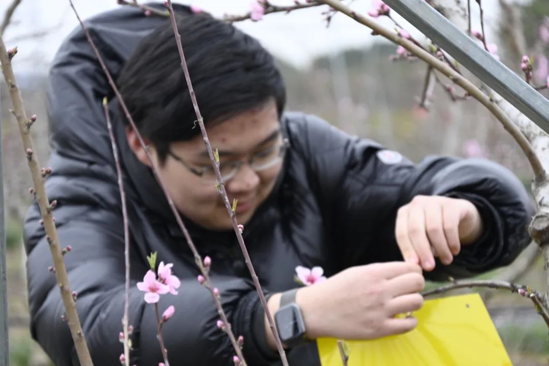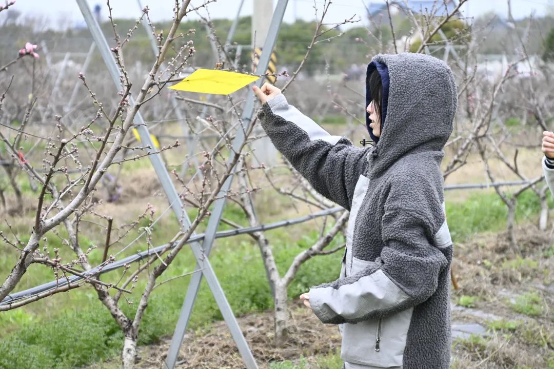 ▲2021级UIPE班进行劳动实践,为黄桃树挂粘虫板、迷向丝