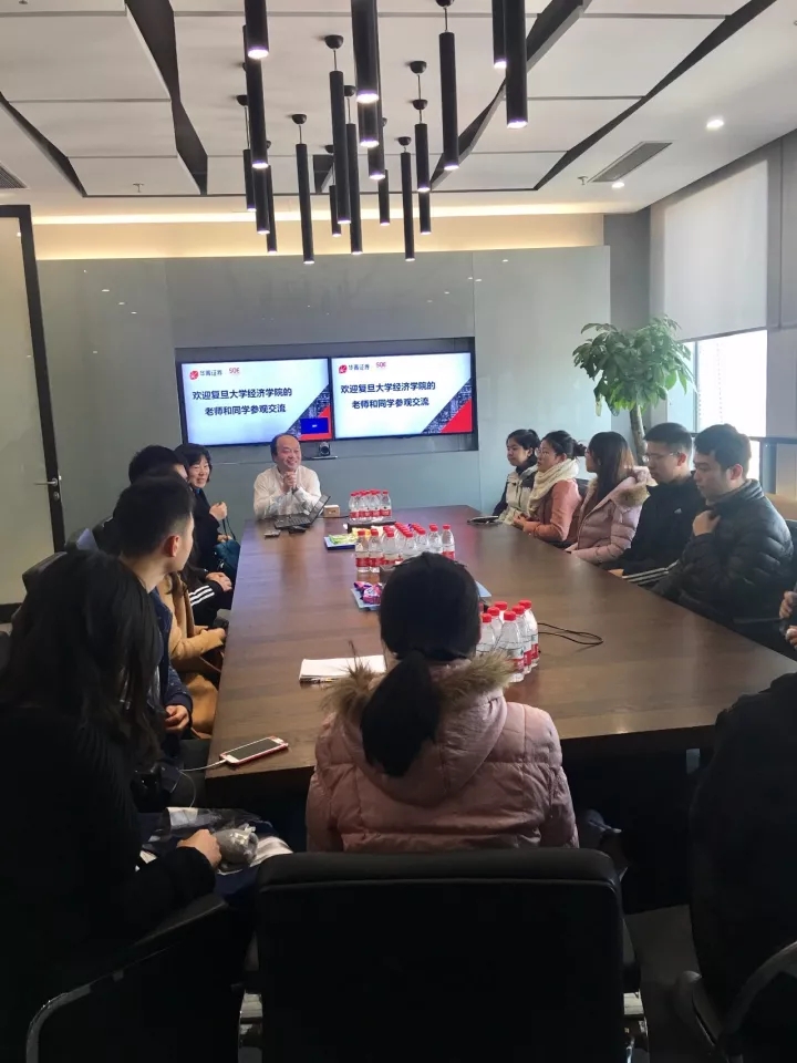在华菁证券,经院同学们受到了热情的接待。会议室以及整个办公层的装修风格就像华菁证券本身一样——年轻、时尚、朝气蓬勃。同学们满怀期待地坐下来,准备好纸和笔,开始倾听资深前辈们的分享,参观学习活动从观看公司宣传片开始,让同学们全面了解了公司发展历程;几位华菁证券的高管耐心地向同学们讲解了证券公司的主要业务,让同学们对行业有了初步的了解;最后,两位在华菁证券实习的复旦学姐和一位新入职的师兄与大家分享了在华菁实习和工作的体验与收获。