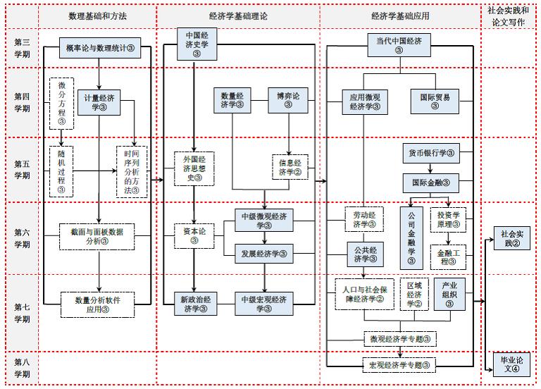 本方向的专业教育课程可以细分为以下四个模块:数理基础和方法、经济学基础理论、经济学基础应用、社会实践和论文写作。四个模块中各门课程的逻辑上下承接关系导向图如图1所示。其中,左侧为学期序号,实线框表示必修课,虚线框表示选修课,方框内部圆圈中数字为学分数。课程之间的有方向的箭头表示前后承接,无方向的箭头表示课程之间存在紧密的联系。