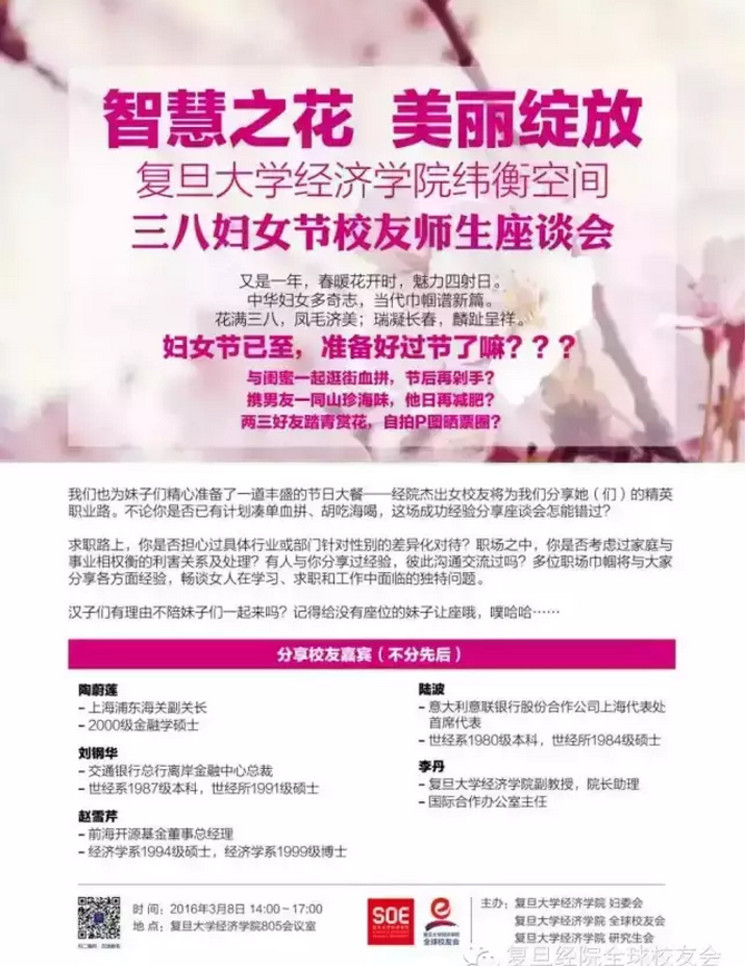 我们也为妹子们精心准备了一道丰盛的节日大餐——经院杰出女校友将为我们分享她(们)的精英职业路。不论你是否已有计划凑单血拼、胡吃海喝,这场成功经验分享座谈会怎能错过?