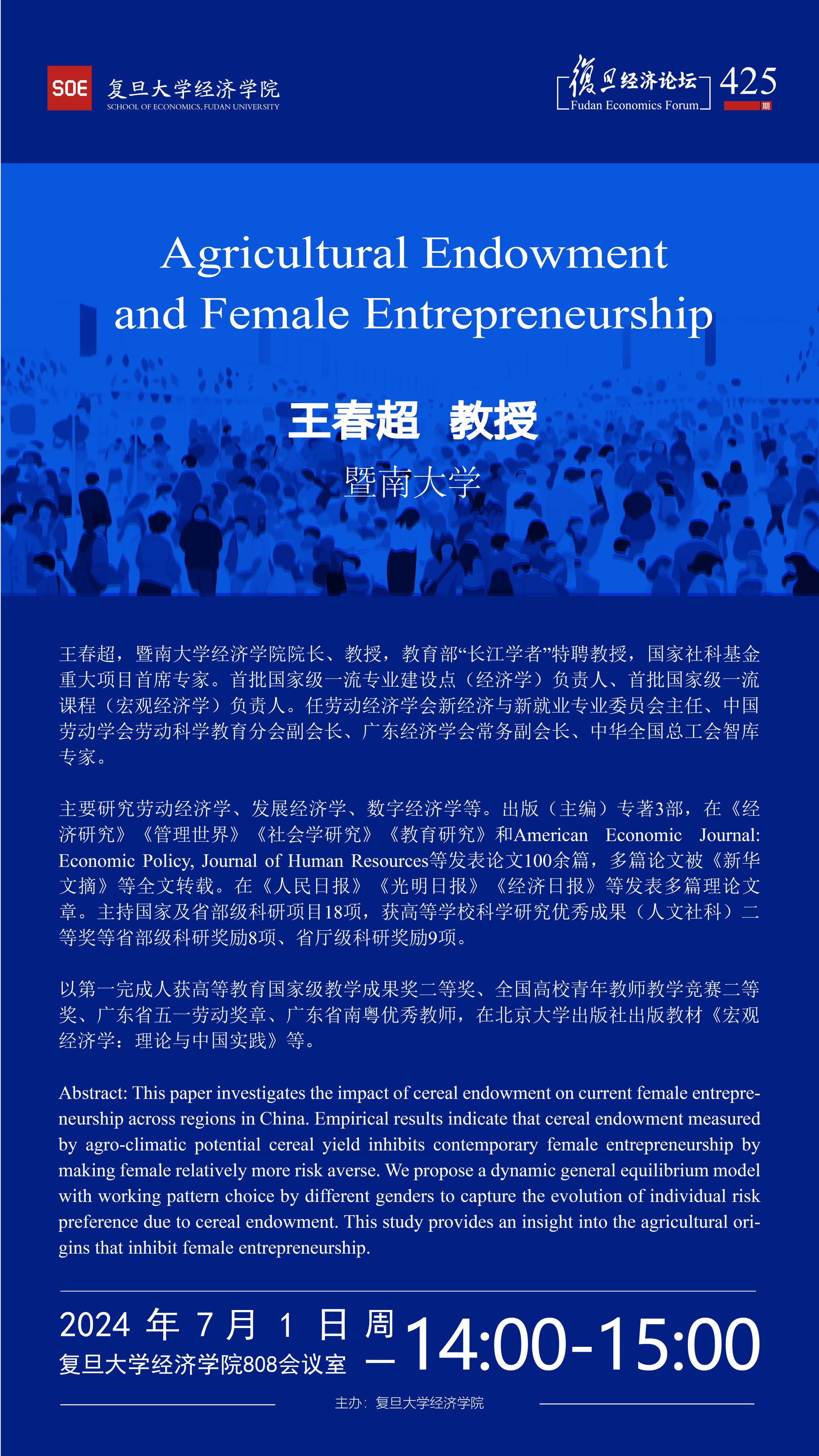 【论坛主题】Agricultural Endowment and Female Entrepreneurship