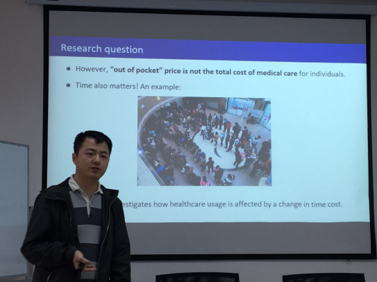 接着,黄老师对自己研究的理论基础和实证部分进行了介绍。黄老师借鉴了2013年Aguiar 和 Hurst发表在JPE上的文章,在既有模型的基础上,加入了时间成本因素,从而提出了自己的理论模型,为自己后续的实证分析奠定了理论基础。随后,黄老师又对自己研究所采用的数据进行了简单的介绍和优势分析。在实证分析中,黄老师利用退休制度这一外生事件带来的冲击,通过RDD的方法,去验证退休前后患者的一系列变化,结果发现劳动供给在退休前后发生了明显的变化,患者的门诊就诊率没有发生明显的变化,但住院率发生了明显的变化。这初步验证了黄老师的猜想:即随着患者进入退休状态,他的时间成本相对于工作时有所下降,从而使得住院率在退休年龄附近有一个明显的跳跃。在基本结论的基础上,黄老师也分别从教育背景、医院类型、住院天数、家庭支出等方面,进行了进一步的异质性分析,为自己的猜想提供了更多的证据。