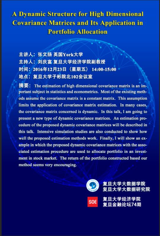 复旦金融论坛第74期:A Dynamic Structure for High Dimensional Covariance Matrices and Its Application in Portfolio Allocation