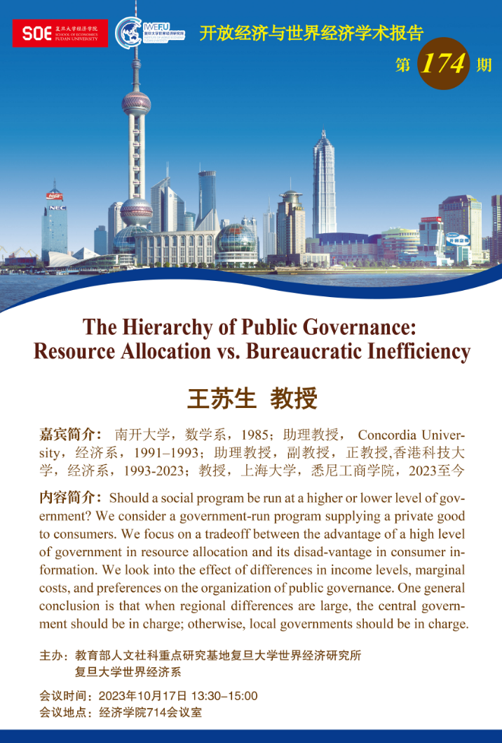 内容简介: Should a social program be run at a higher or lower level of government? We consider a government-run program supplying a private good to consumers. We focus on a tradeoff between the advantage of a high level of government in resource allocation and its disad-vantage in consumer information. We look into the effect of differences in income levels, marginal costs, and preferences on the organization of public governance. One general conclusion is that when regional differences are large, the central government should be in charge; otherwise, local governments should be in charge.