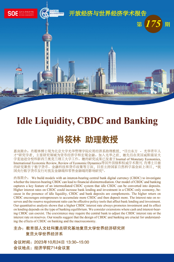 嘉宾简介: 肖筱林博士现为北京大学光华管理学院应用经济系助理教授,“日出东方 - 光华青年人才”研究学者,主要研究领域为货币经济学和宏观金融。加入光华之前,她先后在美国威斯康星大学麦迪逊分校和新西兰奥克兰理工大学工作。她的研究成果已发表于Journal of Monetary Economics, International Economic Review, Review of Economic Dynamics等国外顶级和权威学术期刊. 肖博士目前的研究聚焦于数字货币、金融科技和货币政策等方面,目前主持国家自然科学基金面上项目,“我国央行数字货币发行对批发金融端和零售金融端的影响研究"。