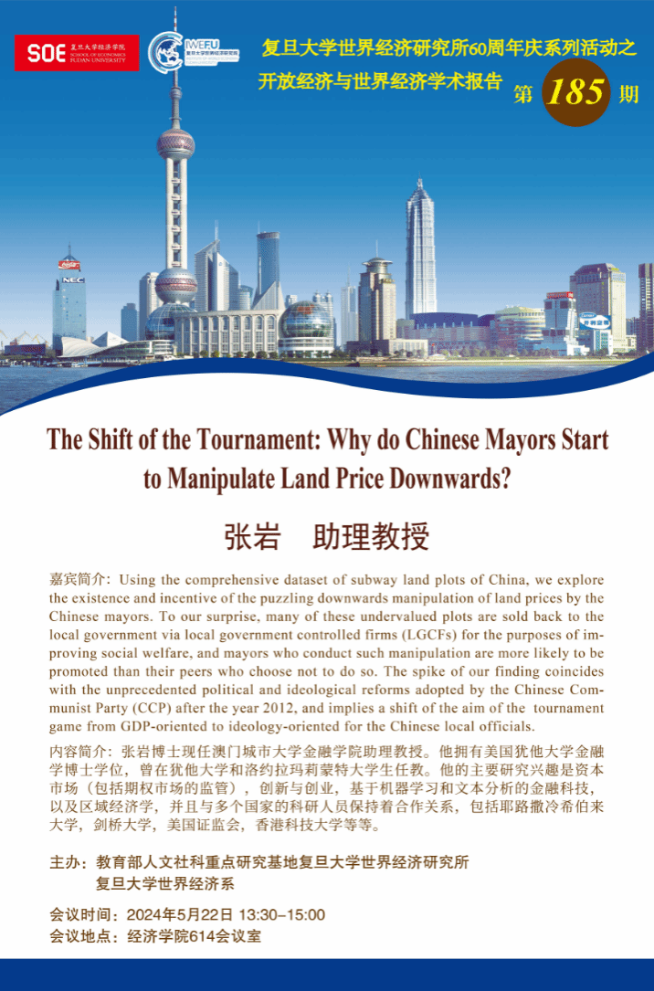 主题:The Shift of the Tournament: Why do Chinese Mayors Start to Manipulate Land Price Downwards?