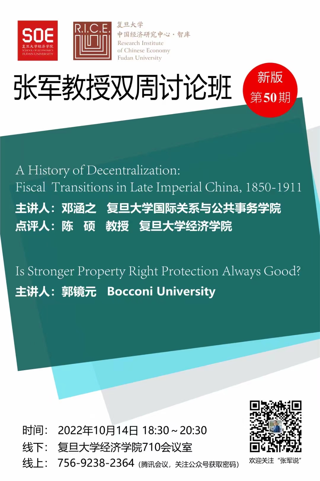 张军教授双周讨论班第50期:A History of Decentralization: Fiscal Transitions in Late Imperial China, 1850-1911