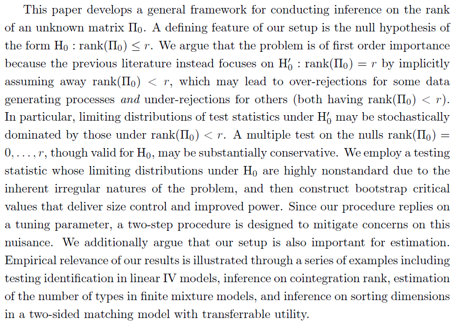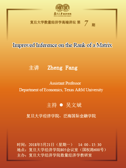 Zheng Fang is currently an assistant professor at Texas A&M University. His research area is Econometrics. He studies bootstrap inference in nonstandard problems where the parameters of interest exhibit certain forms of irregularity such as nondifferentiability and first order degeneracy. Currently he has a paper under R&R at Review of Economic Studies and two papers under R&R at Journal of Econometrics. Zheng Fang obtained his BS degree in 2008 and MS degree in 2010 both in Economics from Tsinghua University; he obtained his MS degree in Statistics in 2013 and PhD in Economics in 2015, both from UC San Diego.