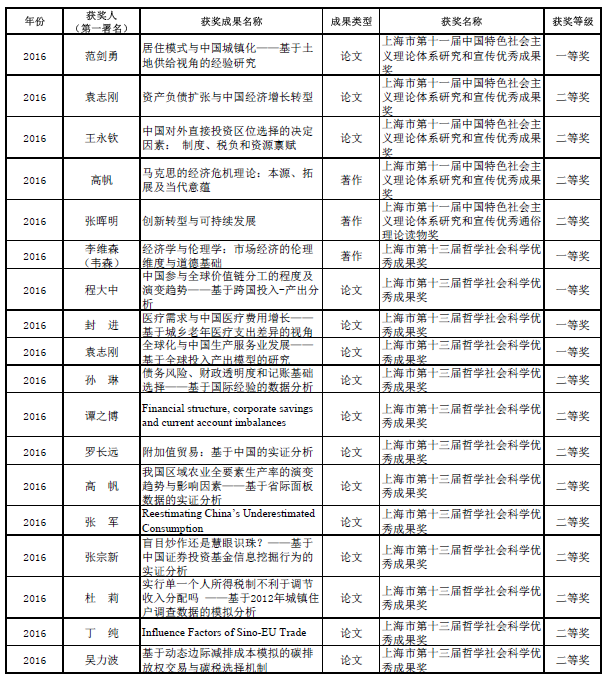 2016年“上海市第十三届哲学社会科学优秀成果奖”、“上海市第十一届中国特色社会主义理论体系研究和宣传优秀成果奖”获奖情况