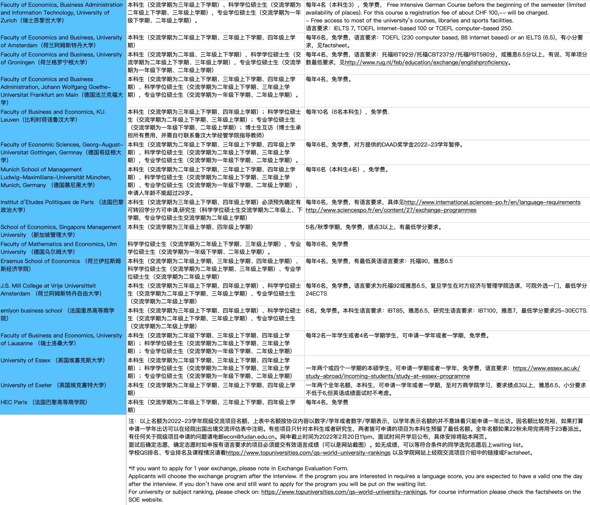 各校信息请见学院网站上经院交流项目介绍中的链接或Factsheet。