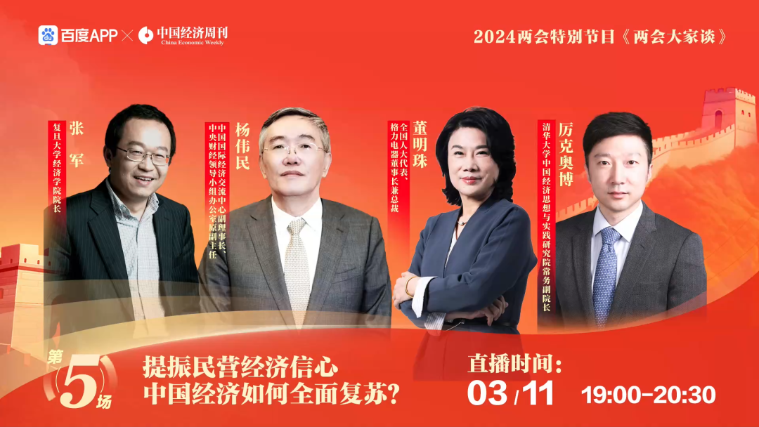 2024年全国两会期间,中国经济周刊联合百度APP,邀请代表委员、学者型官员、商界领袖、经济学家、行业专家,推出《两会大家谈》系列直播,旨在通过专业的探讨,分析现象背后的本质。3月11日的第五场直播关注民营经济话题:今年中国经济的增长目标定为5%左右,要想达到5%左右的经济增速,可能会面临哪些困难,应该如何应对,如何突破经济的内部约束?民营企业家“出海”有何经验可循?新质生产力的提高将对就业和消费产生哪些影响?日本av片