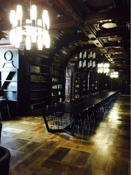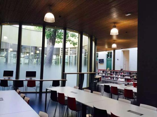自习的地方主要在图书馆,图书馆配有几十台iMac满足大家的需求,图书馆藏有法语英语书籍,同时开通了与巴黎校区间的互借服务。顺着新图书馆对面的宫殿式的楼梯走上顶楼,就是保留了原始样貌的老图书馆,馆中图书可以随意拿取,无需手续,只要拿上自己的藏书主动填充就好。